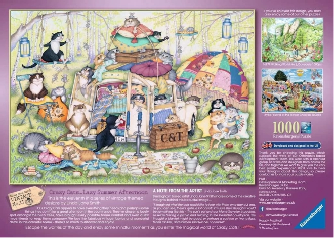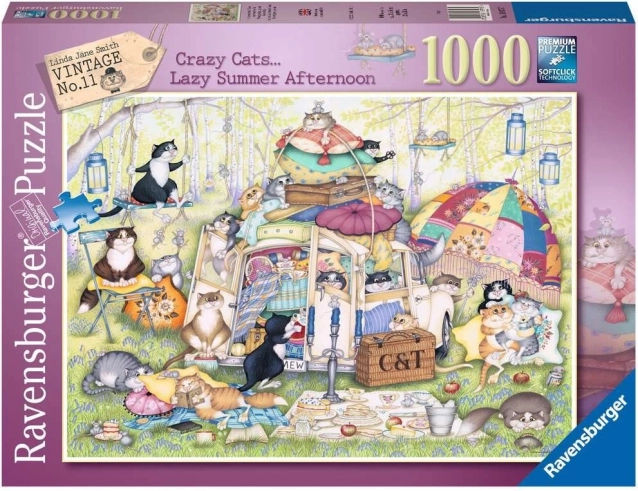 Uživajte v mirnih trenutkih s sestavljanko 1000 koščkov iz serije CRAZY CATS. Motiv »Leno poletno popoldne« bo navdušil ljubitelje mačk in humorja, po sestavi pa ustvari sliko velikosti približno 70 × 50 cm z kakovostno izdelavo in natančno prilegajočimi se deli.