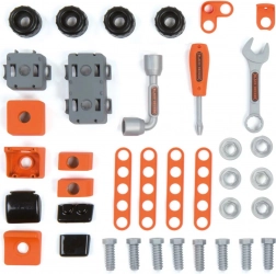 Del kompleta so vsi ključni elementi, kot so izvijač, ključi, vijaki in drugi, podpirajoč domišljijo in fino motoriko.