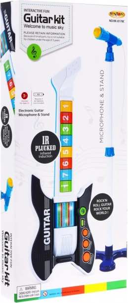 | Dimenzije | - kitara približno 56 cm x 21 cm x 3 cm, - mikrofon na stojalu približno 80 cm x 20 cm, - embalaža približno 56,5 cm x 25 cm x 6 cm. |