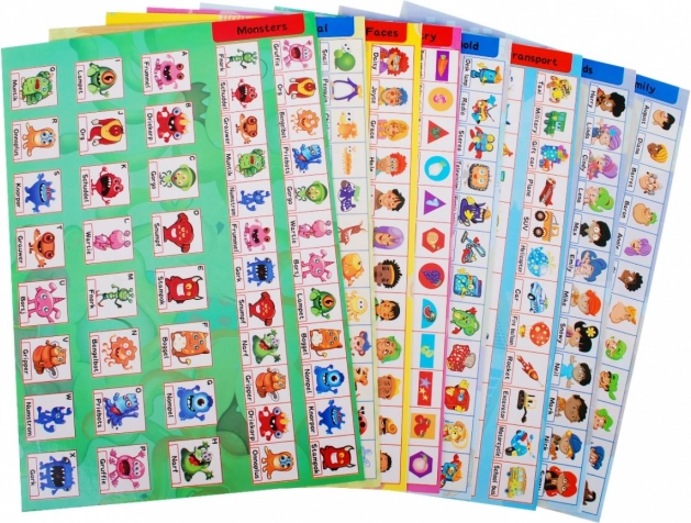 Ilustrirane karte s kategorijami (obrazi, oblike, promet, družina, pošasti) podpirajo razvoj besedišča, pozornosti in sposobnosti ustvarjanja asociacij.
