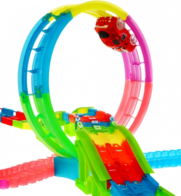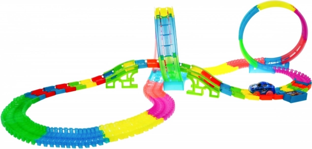 Ta velik set vsebuje 166 gradbenih delov prožne proge, ki jih preprosto zaskočite v različne oblike, vključno z zankami 360° in nadvišanji. Fluorescenčna površina delov se po osvetlitvi v temi razsvetli in skupaj z LED učinki avtomobilčkov ustvari očarljiv prizor.