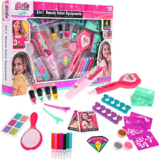 Čudovit set 3v1 za dekleta je idealen za kreativno stiliranje barvnih las, manikure in tetoviranja. Ta set združuje varne in netoksične kozmetične pripomočke, ki jih po koncu zabave zlahka odstranite.