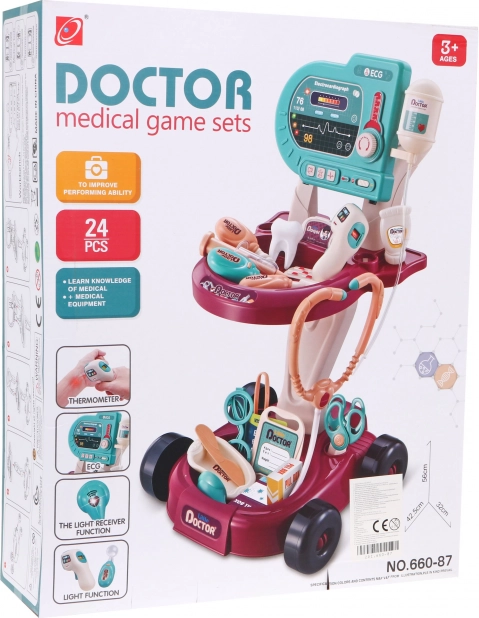 Dobrodošli v svetu medicine s tem celotnim zdravniškim kompletom! Voziček je opremljen z 24 interaktivnimi pripomočki, vključno z EKG ploščo s svetlobnimi in zvočnimi efekti, ki posnemajo resnične zdravniške pripomočke. Stetoskop in termometer prav tako nudita zvočne in svetlobne efekte, tako da se otroci počutijo kot pravi zdravniki.