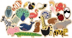 Komplet lesenih magnetkov DJECO prinaša pisano zbirko priljubljenih živali – od pava, žirafe in krokodila do hobotnice, povodnega konja, zebre in sove. Otroci si zlahka ustvarijo svoj živalski svet, pripovedujejo zgodbe ter se učijo prepoznavati oblike in barve.