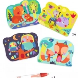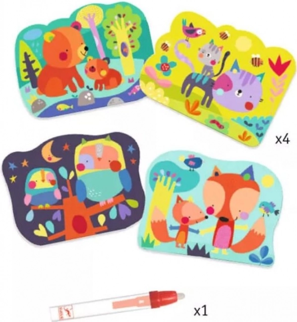 Vodne pobarvanke DJECO prinašajo otrokom od 18 mesecev dalje preprosto in čisto ustvarjanje brez barvic. Na štirih trdnih kartah velikosti 21 × 26 cm se ob stiku z vodo pojavijo simpatični liki – medvedek, mucka, sovica in lisica. Ko se voda posuši, se slika skrije in igra se lahko začne znova.