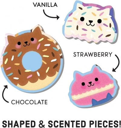 Potopite se v svet vonjev in barv z izvirno sestavljanko, kjer se zlaganje spremeni v multisenzorično izkušnjo. Otroke bodo razveselili trije ponavljajoči se vonji – jagodni, vaniljev in čokoladni – ter izrazito barvna, podrobna ilustracija mačje kavarne. Zaradi mat površine so barve verodostojne in ne odbijajo svetlobe, zato je zlaganje udobno v vseh pogojih.