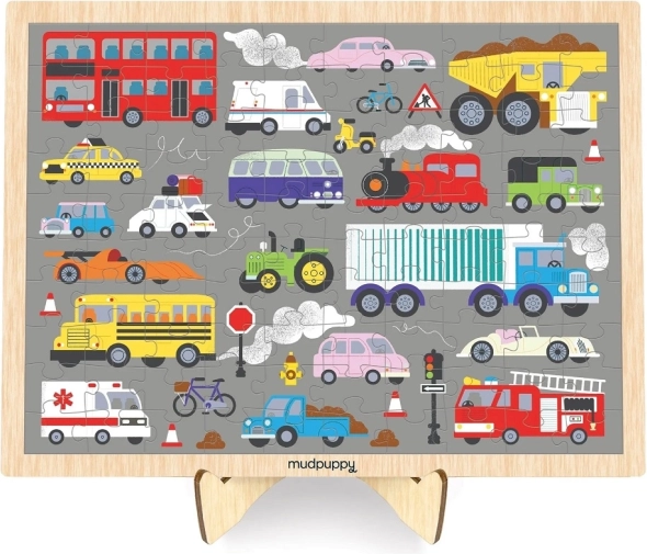 Odkrijte zabavo in učenje z leseno sestavljanko MUDPUPPY na temo prevoznih sredstev. Komplet vsebuje 100 trdnih lesenih koščkov z lepimi ilustracijami avtomobilov, tovornjakov, avtobusov in drugih ter dodatno praktično leseno stojalo za razstavljanje končne slike kot dekoracije.