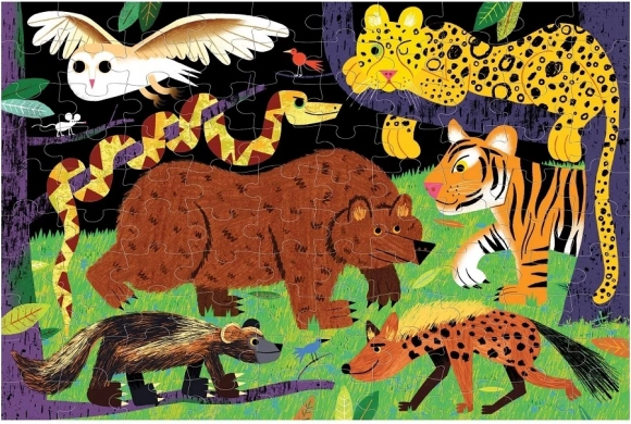 Odkrijte zabavno in poučno sestavljanje s sestavljanko MUDPUPPY Plenilci divjine, ki sveti v temi. Komplet s 100 koščki ponuja pisano prizorišče živalskih lovcev, kakovosten tisk z neškodljivimi barvami, mat premaz za verne barve in je izdelan iz recikliranih materialov.