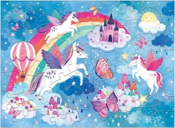 Barvita ilustracija s samorogi, mavrico in metulji vabi k sestavljanju ter spodbuja domišljijo in potrpežljivost.