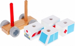 To leseno reševalno vozilo je idealno za prve gradbene in motorične igre. Otroci natikajo štiri kocke na dva zatiča v osnovi in si sestavijo lastno vozilo s prepoznavnimi simboli reševalnih služb. Prožna kolesa omogočajo gladko vožnjo po tleh ter spodbujajo domišljijo in tematsko igro reševalcev.