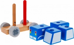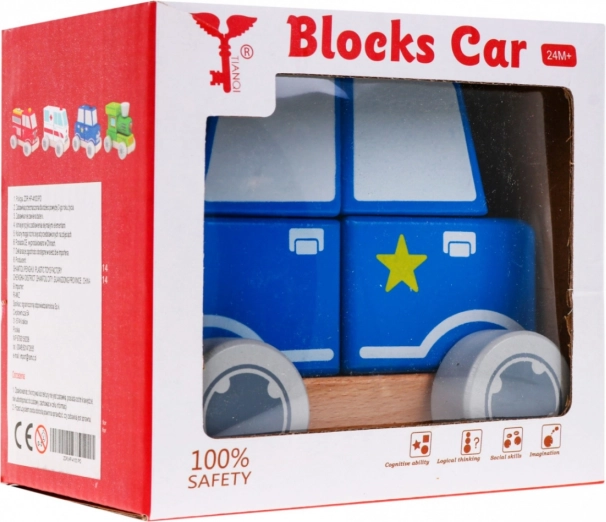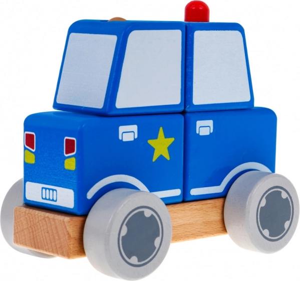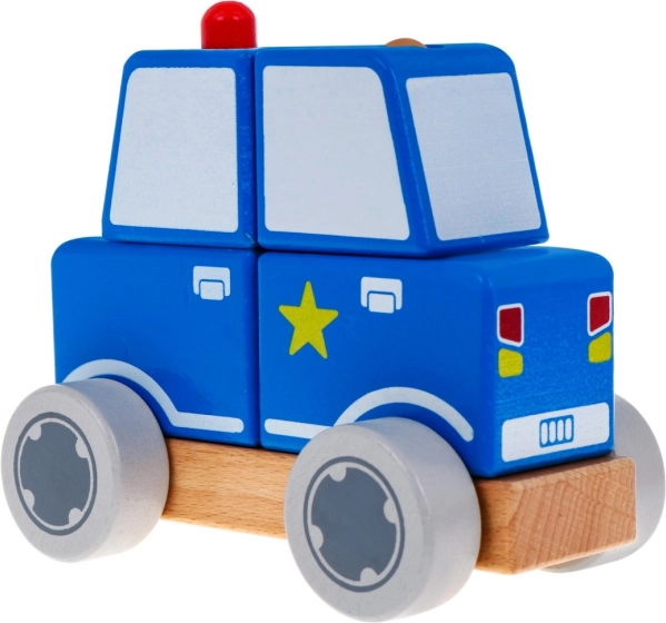 Štiri lesene kocke se nataknejo na dva zatiča in skupaj tvorijo realistični policijski avtomobilček. Idealno za prve logične naloge.