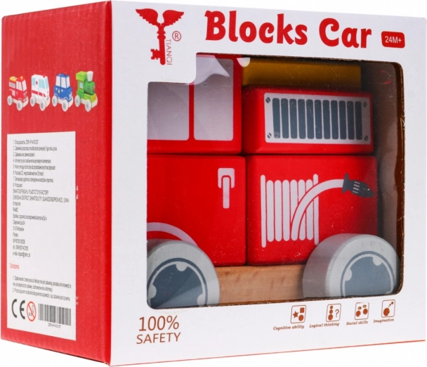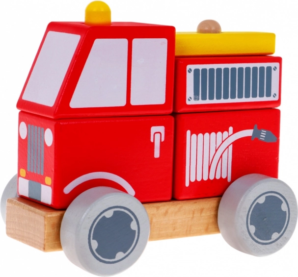 Sestavite svoj gasilski voz iz kompleta lesenih kock. Otrok natika dele na dva zatiča na podstavku in tako ustvari preprosto sestavljanko, ki podpira koordinacijo oko–roka, potrpežljivost in logično razmišljanje. Gladko obdelan les in obstojne barve so prijazni do otroških rok in okolja.