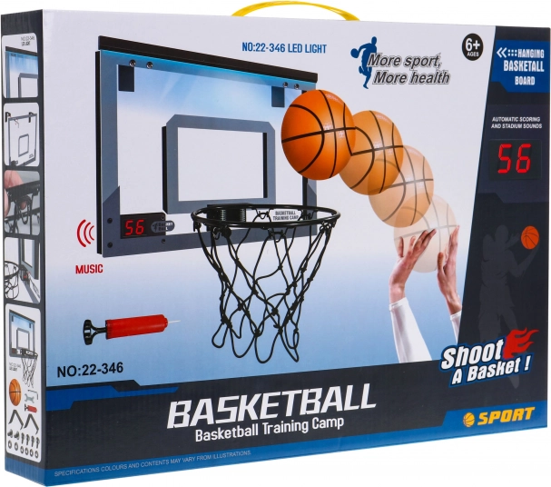Z samodejnim točkovanjem in stadionškimi zvočnimi učinki je ta košarkarski set idealna rešitev za aktivne otroke. Enostavno namestitev na vrata omogoča priložen montažni material. Set napajajo tri baterije tipa AAA 1,5 V (niso priložene).