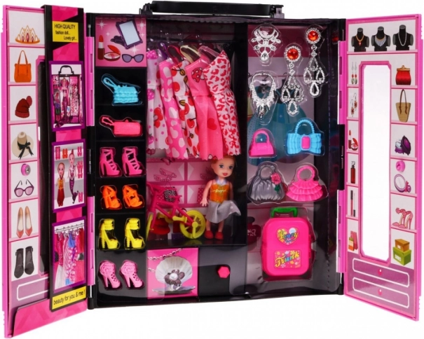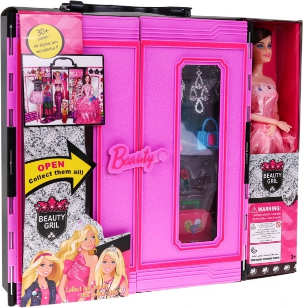 Garderoba s punčko je čudovit, velik in barvit komplet, ki je sanje vsake majhne gospodične. Ta komplet vsebuje 30 elementov in ima ročaj za enostavno prenašanje, da ga lahko vaš otrok vzame kamorkoli.