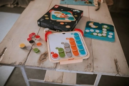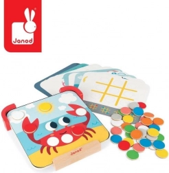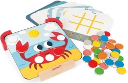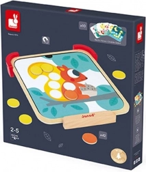 Magnetna didaktična igra Učim se barve znamke JANOD ponuja celovito dejavnost za male radovedneže. V kompletu so lesena magnetna tabla s stojali, 42 barvnih magnetnih krogcev, 10 dvostranskih predlog z nalogami in kreda. Otroci nameščajo magnete na prava mesta po predlogah, urijo barve, vzorce in zbranost – tablo pa lahko uporabijo tudi za risanje ter prve poskuse pisanja črk ali številk.
