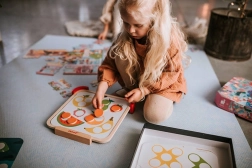 Otroci razporejajo barvne krogce po predlogah, vadijo prepoznavanje barv, vzorcev in zbranost – na zabaven način in brez pritiska.