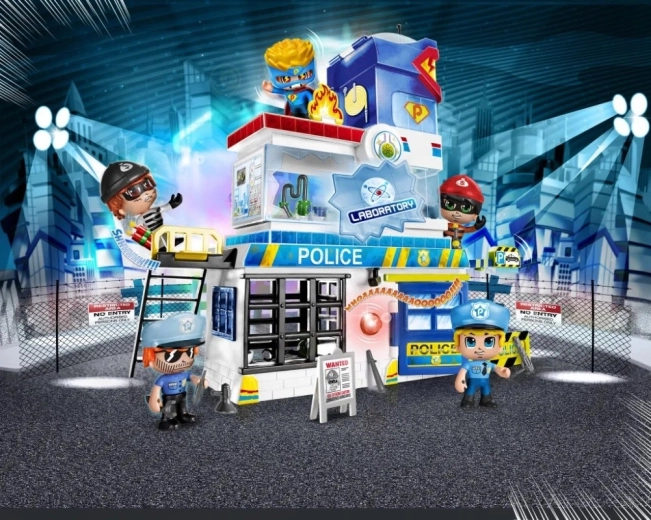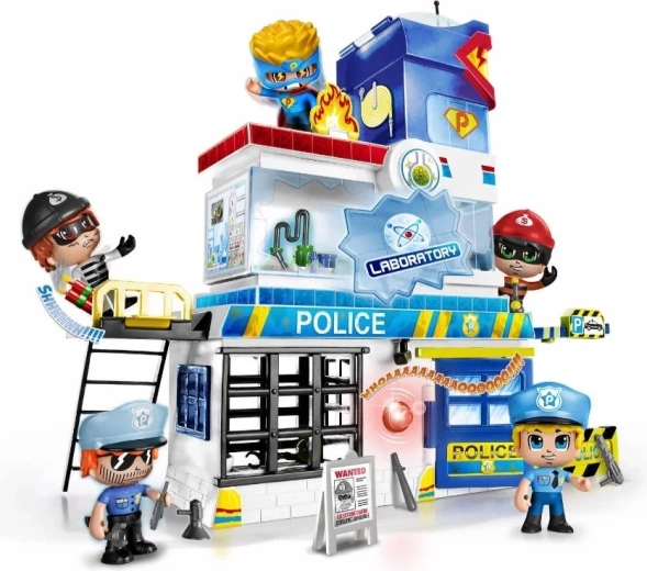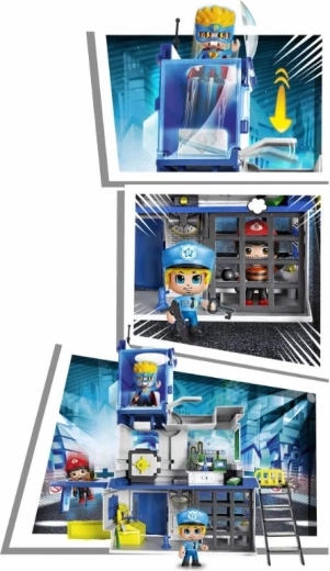 Realistična policijska postaja s prostori, lestvami in vrati spodbuja otroke k odprtemu pripovedovanju in ustvarjanju lastnih misij.