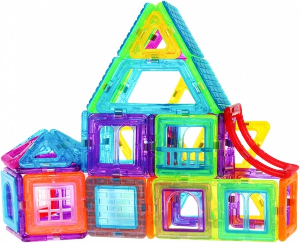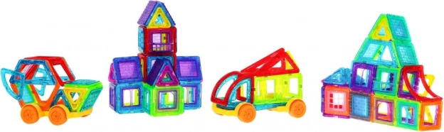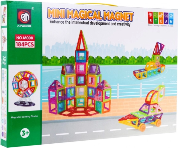 | | Velik komplet magnetnih kock je igrača, namenjena otrokom od 3. leta dalje, z veseljem pa se bodo z njo igrali tudi starejši otroci in celo odrasli. Gradbeni komplet pozitivno vpliva na razvoj ustvarjalnosti, uči potrpežljivosti in zbranosti. Kocke so lahke in trpežne, iz njih pa je mogoče graditi izjemne konstrukcije. Torej, lotite se dela! | Vsebina kompleta | * kocke 184 elementov * 4 podvozja z dvema kolesoma, približno 9 cm x 5 cm, * 8 elementov konstrukcije vrtiljaka (ruskega kolesa), * 2 peterokotnika, * 2 šestkotnika, približno 8,5 cm x 7,5 cm, * 8 oken z ograjo, približno 4 cm x 2,5 cm, * 2 trojni kvadrati, približno 13 cm x 4,5 cm, * 6 dvojnih kvadratov, približno 8,5 cm x 4,5 cm, * 56 kvadratov, približno 4,5 cm x 4,5 cm, * 24 oken, približno 7,5 cm x 4 cm, * 6 trapezov, približno 6 cm x 4 cm, * 6 dodatnih delov, * slikovni priročnik, * embalaža približno 51 cm x 35 cm x 5 cm. |