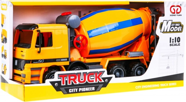| Gradbeni tovornjak – betonski mešalec je namenjen otrokom od 3. leta starosti. Igrača je izdelana z upoštevanjem vsake podrobnosti in je zvesta reprodukcija gradbene tehnike. V zadnjem delu vozila je namejen lijak za polnjenje bobna ter vrtljiv žleb za izpust »betona«. Boben je premičen in ga je mogoče vrteti s pomočjo ročice na boku vozila. Kabino vozila je mogoče, tako kot pri pravem vozilu, nagniti naprej. Betonski mešalec ima velika široka kolesa in lahko vozi po različnih podlagah. Idealen je za uporabo v notranjih in zunanjih prostorih. Vozilo je opremljeno s pogonom na sprednja kolesa. Igra z betonskim mešalcem razvija spretnost, spodbuja otroško domišljijo in ustvarjalnost ter podpira koordinacijo oko–roka. |