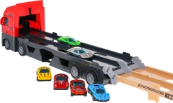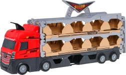 Na strehi tovornjaka je udoben ročaj za enostavno prenašanje. V notranjosti najdete 3 ravni za razvrščanje in shranjevanje avtomobilčkov, tako da so vedno pri roki. Katapult je preprost za upravljanje – dovolj je, da avtomobilček postavite na spodnjo raven in pritisnete ročico na strehi. Baterije niso potrebne.