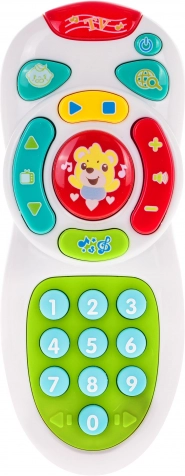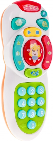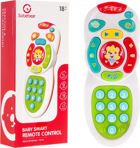 Interaktivni, večfunkcijski daljinski upravljalnik z zvočnimi in svetlobnimi učinki za otroke od 18 mesecev dalje. Igrača je izdelana iz najkakovostnejše plastike in nima ostrih robov. Ima velike gumbe za aktiviranje zvočnih in svetlobnih učinkov, zato jo je enostavno upravljati z majhnimi otroškimi rokami. Pod vsakim gumbom so zabavne melodije in zvoki, na voljo je tudi gumb za vklop in izklop igrače ter gumb za uravnavanje glasnosti. Na sredini daljinca je velik gumb s sliko medvedka, ki med predvajanjem glasbe utripa. Gumb v zgornjem delu daljinca z napisom TV je prav tako osvetljen. Igrača deluje na baterije tipa 3 x 1,5 V AAA, baterije niso priložene. .Specifikacije igrače: .- pravljične barve, .- nabor vgrajenih melodij, .- dodatni zvoki – zvok bitja srca, zvoki živali, številke od 0 do 9 v angleščini, .- utripajoča LED dioda na gumbu s sliko medvedka, .- osvetlitev gumba TV ob pritisku katerega koli gumba, .- velika tipkovnica z gumbi, označenimi s številkami, .- uravnavanje glasnosti. |