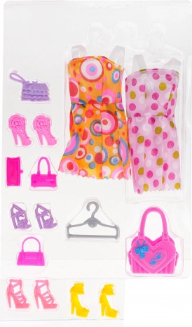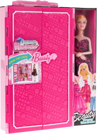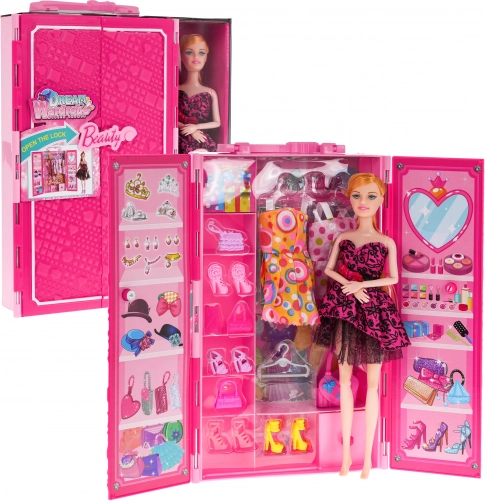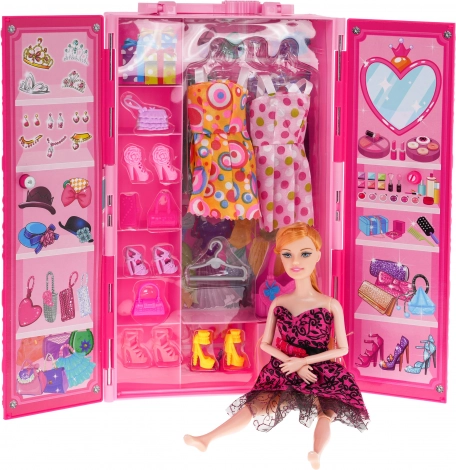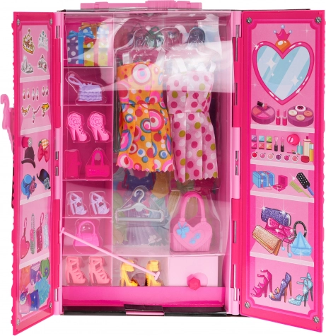V kompletu je lutka v družabni obleki ter bogat nabor: 2 obleki, 5 torbic, 4 pari čevljev, 3 obešalniki in škatlica za drobnarije. Omaro lahko odprete v širši položaj za boljši pregled in stilski prikaz oblačil.