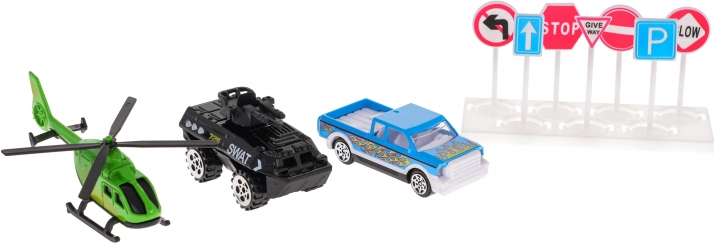 Set dopolnjuje velika igralna podloga s cestami za razširitev igralnega sveta ter dva kovinska avtomobilčka v merilu 1:64. Zahvaljujoč intuitivnemu upravljanju je igrača primerna za otroke od 3 let naprej in spodbuja motoriko, domišljijo ter osnove prometne vzgoje.