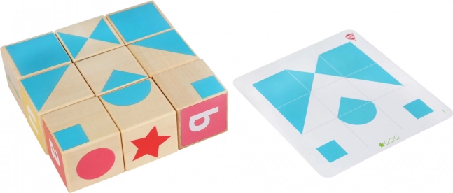 Garnitura vsebuje tudi okvirno podlago z abecedo in 15 obojestranskih kartic s posebnimi predlogami. Otroci lahko postavljajo kocke na prava mesta ali ustvarijo vzorce po zgledu, ki spominja na tangram. Izdelano iz kakovostnega lesa in pobarvano z netoksičnimi barvami, zagotavlja varno in zabavno igro.