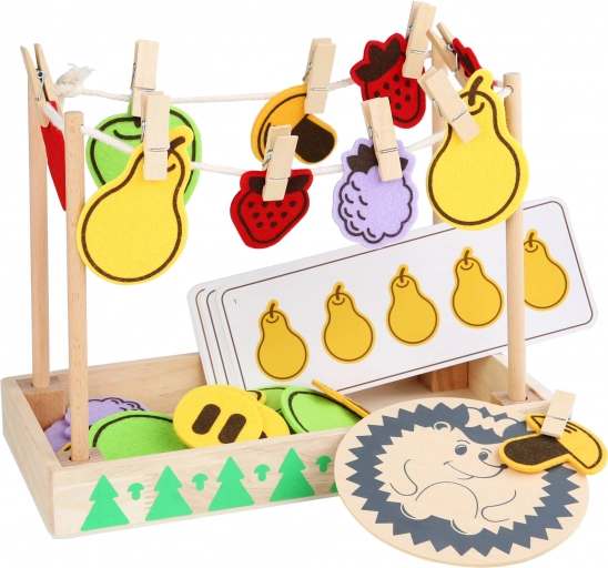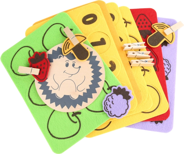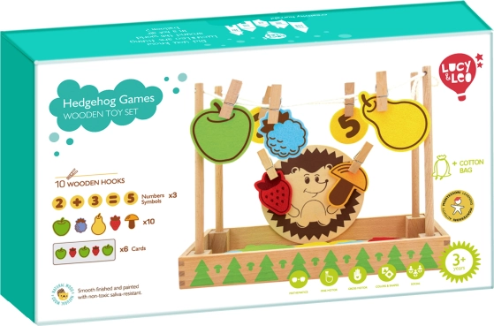 Komplet vključuje leseno osnovo, ježka, zabavne kartice in barvne filc podloge - idealno tudi za skupno igro več otrok. Za lažje shranjevanje je vse zapakirano v praktični bombažni vrečici.