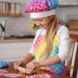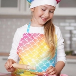 Vpadljiv vzorec v barvah mavrice doda vsaki peki pridih stila. Moden predpasnik z žepom in ujemajoča se kapa ščitita oblačila in hkrati odlično izgledata.