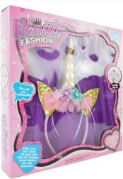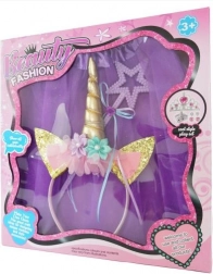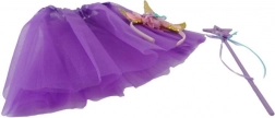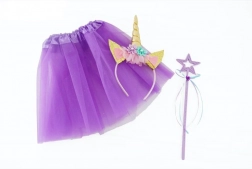Prisrčen preoblečni komplet bo razveselil vsako malo ljubiteljico samorogov. Puhasto tutu krilo v nežni vijolični, udoben naglavni obroč z rogom, okrašen s cvetlicami in bleščečimi ušeski, ter lahka paličica z zvezdico v hipu ustvarijo popolno pravljično opravo.