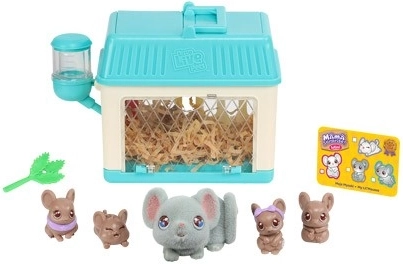 Mini komplet Mama Surprise! Poskrbite za mamo, nahranite jo, dajte jo v kletko, nalijte vodo v napajalnik in živalice bodo prišle na svet! Na svet lahko pridejo 2, 3 ali 4 mladički. To bo presenečenje! Del kompleta so dodatki za oblikovanje živalic, na primer naglavni trakovi.