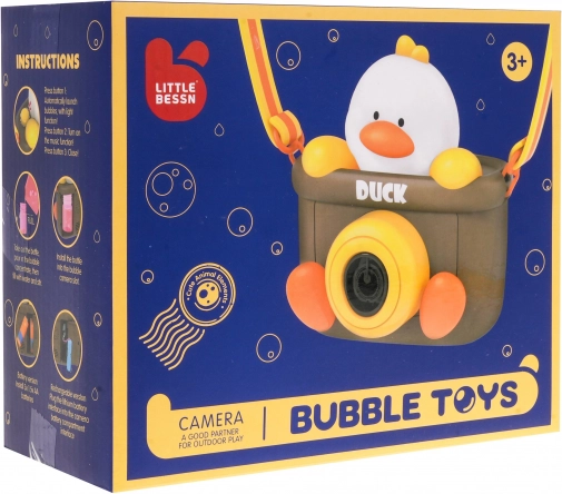 Ta interaktivni otroški fotoaparat ni le v obliki simpatičnega račkota, temveč na dotik gumba ustvarja tudi pisane mehurčke. Dovolj je, da napolnite priloženo tekočino za mehurčke in dodate baterije (3 x AA, niso priložene). V zgornjem delu fotoaparata je šoba, iz katere ob spremljavi veselih melodij in zvokov sprožilca kot pri pravem fotoaparatu izhajajo mehurčki.