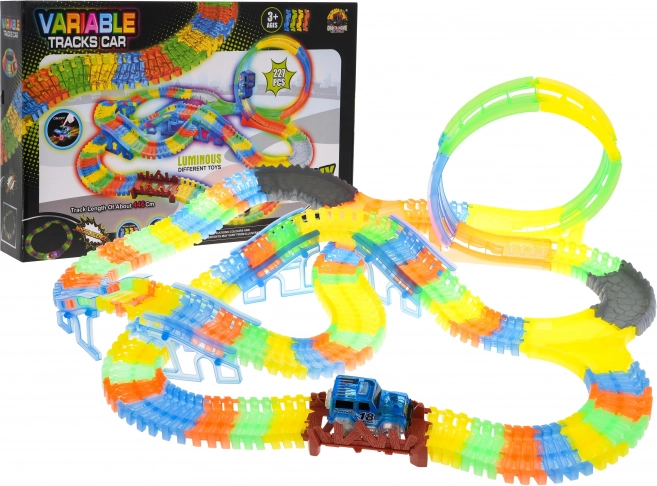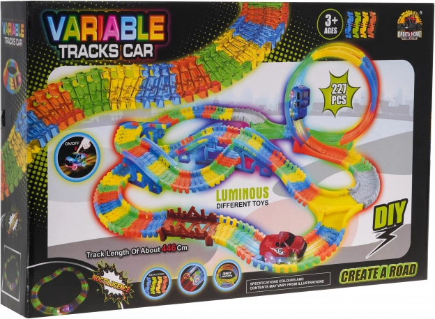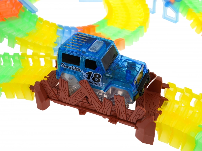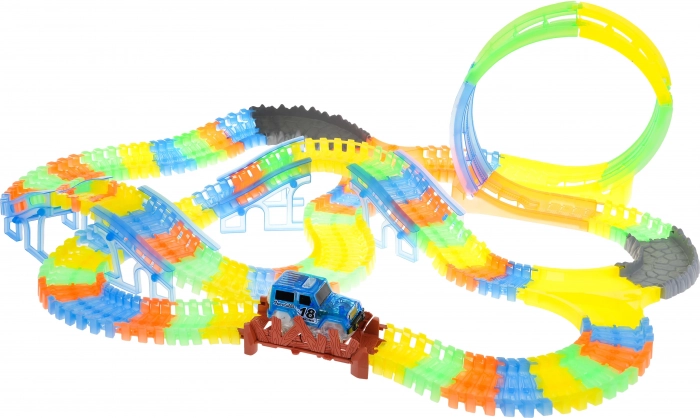 Svetleča proga z zanko in avtomobilčkom v kompletu je primerna za otroke od 3. leta dalje. Proge so fleksibilne, lahko jih razporedite v poljubnih kombinacijah, obračate, dvigate, preurejate – tudi med vožnjo avtomobilčka. Proge so fluorescenčne in v temi svetijo. Vozilo, ki je del kompleta, ima LED osvetlitev, vožnja v temi ustvarja odličen učinek. Vozilo napajata 2 bateriji AA 1,5 V, bateriji nista priloženi. Za zagon avtomobilčka pritisnite gumb na strehi. Skupna dolžina proge je 446 cm. . |