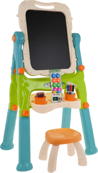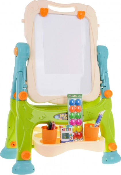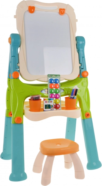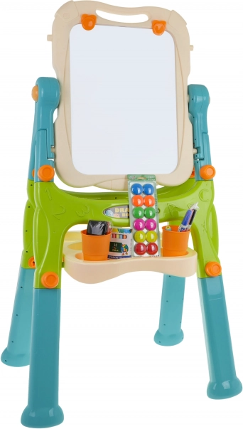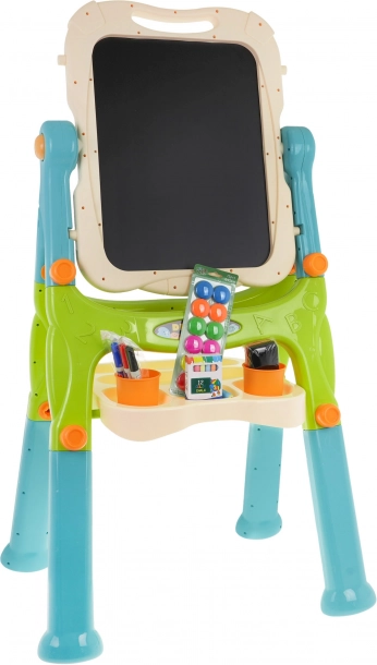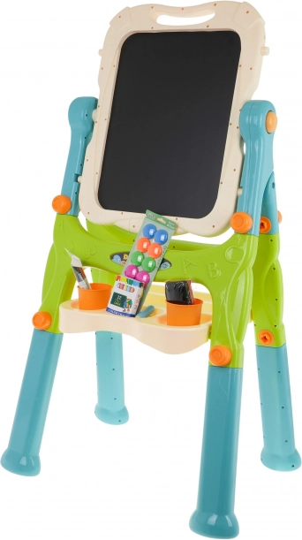 Ta ustvarjalni komplet združuje magnetno belo tablo za pisanje z markerji in pritrjevanje magnetov s črno kredno površino za klasično risanje. Tabla se vrti za 360°, ima zaobljene robove za varno uporabo in jo zahvaljujoč zamenljivim daljšim in krajšim nogam zlahka prilagodite trenutni otrokovi višini. Praktična polica ohranja vse potrebščine pri roki, vgrajene sponke pa omogočajo slikanje tudi na papir.