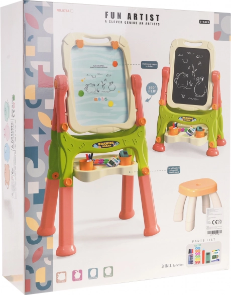 Dvosmerna otroška tabla 2v1 za male umetnike od 3 let ponuja magnetno belo tablo in črno kredno površino, nemoteno vrtenje za 360°, nastavitev višine, praktično polico za dodatke ter udoben tabure. V kompletu ne manjkajo brisljivi markerji, krede, magneti in držalo za papir za neskončno ustvarjalno zabavo.