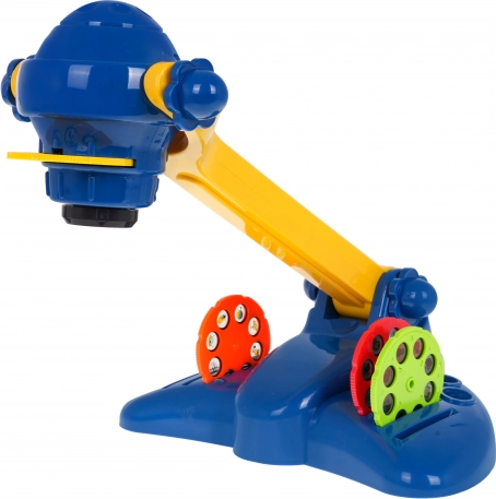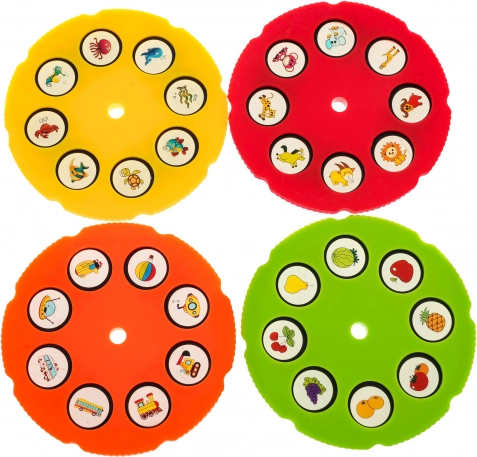Štirje barvni koluti ponujajo vsak po 8 motivov – od živali in sadja do vozil. Otroci se učijo oblike in barve ter na zabaven način vadijo risanje.