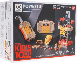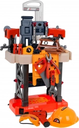 Ta vsestranski komplet za male mojstre se z lahkoto spopade z vsakim domačim »projektom«. Otroci lahko sestavijo stabilno delovno mizo in po igri vse preprosto pospravijo v priročen kovček z ročajem ali prevažajo v vlečnem kovčku na kolesih. Realistični akumulatorski vrtalnik/izvijač na 2× AA bateriji privija in odvija ter med delom sveti z rdečo diodo – povsem kot pravi pripomoček.