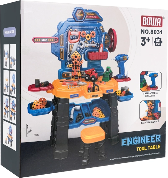 Ta barvit delavni set spremeni otroško sobo v pravo mini delavnico. Robustno delovno mizo s policami in organizatorjem dopolnjujeta udoben stolček in akumulatorski vrtalnik na baterije (2× AA, nista priloženi). Otroci lahko privijajo, vrtajo in sestavljajo lastne projekte, vključno z dvema gradbenima voziloma – nakladačem in prekucnikom.