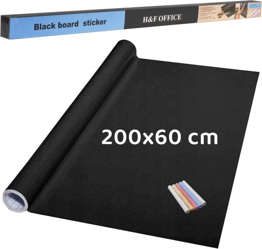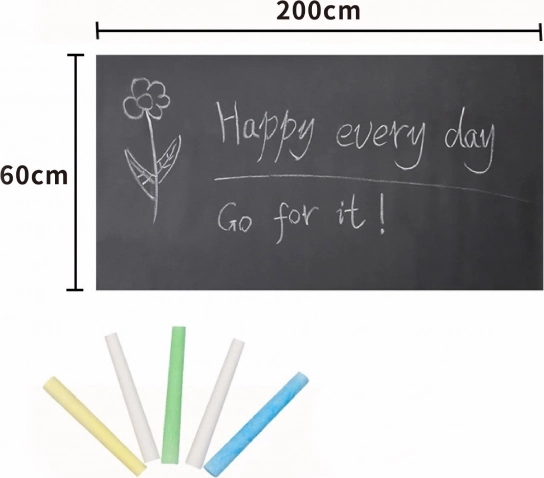 Samolepilna črna tabla ustvarja takoj pripravljeno pisalno površino na gladkih podlagah – omarah, vratih, stenah ali pohištvu. Zahvaljujoč dimenziji 200 × 60 cm nudi dovolj prostora za otroške risbe, družinska sporočila in delovne zapiske. Površina je namenjena klasičnim kredam in se enostavno čisti.