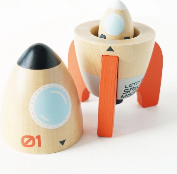 Set vesoljskih raket Le Toy Van je idealno darilo za male raziskovalce. Ta lesen set vsebuje dve raketi – eno večjo z odpirajočim magnetnim pokrovom in manjšo raketo v notranjosti. Vse komponente so izdelane iz FSC certificiranega lesa in pobarvane z netoksičnimi barvami na vodni osnovi, kar jih naredi varne za otroke.