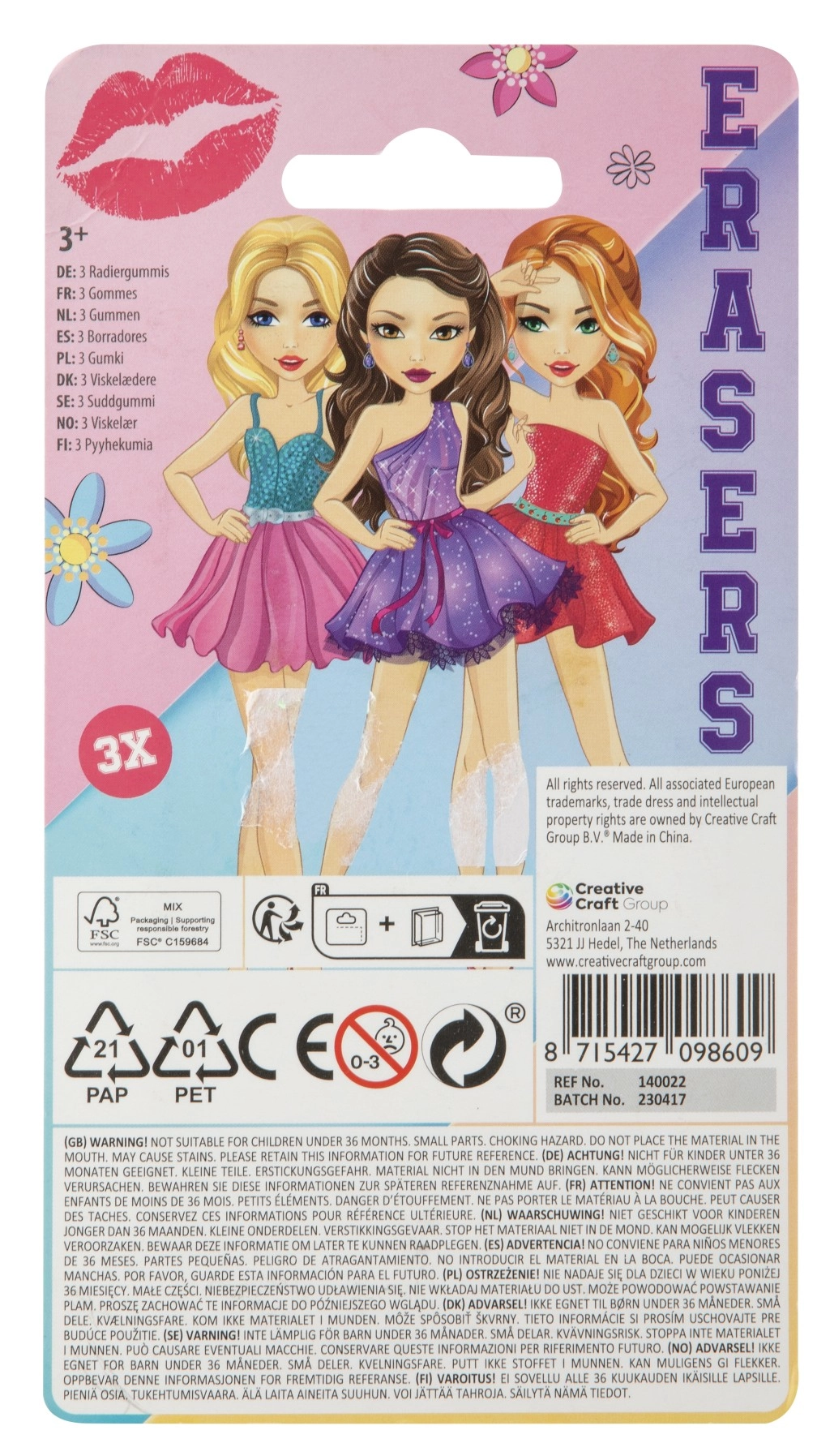 Ta komplet vključuje radirke v obliki šmink v različnih barvah, kar je idealno za šolarje in ustvarjalne posameznike, ki želijo svoji pisarniški zbirki dodati kanček sloga.