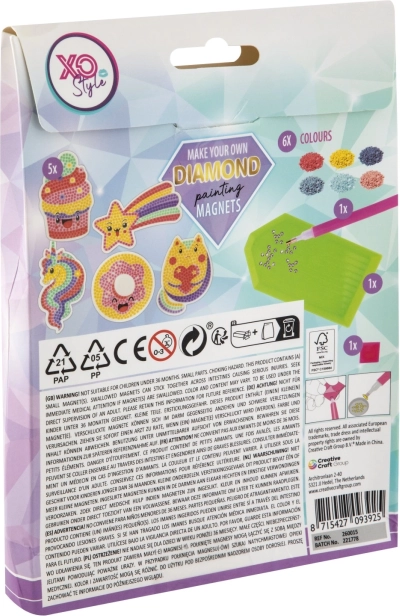 Ta ustvarjalni komplet združuje priljubljeno tehniko “diamond painting” s praktično dekoracijo za dom. Postopoma nalagate drobne kamenčke po predlogi in v hipu nastanejo sijoči magneti z veselimi motivi, ki popestrijo vsak prostor, kamor jih pritrdite.