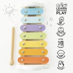 Izdelava iz lesa s certifikatom FSC in površinska obdelava z vodnimi, netoksičnimi barvami zagotavljata varnost in trajnost. Igra s ksilofonom motivira otroke k odkrivanju tonov ter krepi koordinacijo oko–roka.