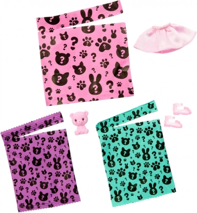- Punčka Chelsea v kostumu, 3 vrečice s presenečenji (krilce, čevlji, mini živalca), dodatki