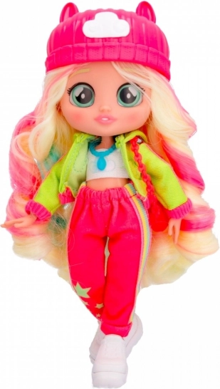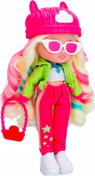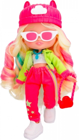 Punčka je oblečena v moden outfit, ki vključuje rožnat klobuk in izrazite dodatke, kar ji daje edinstven videz.