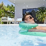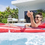 Vgrajen napihljiv vzglavnik nudi oporo vratu in glavi za dolg in nemoten počitek na vodi.