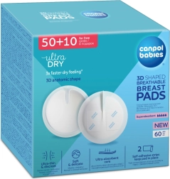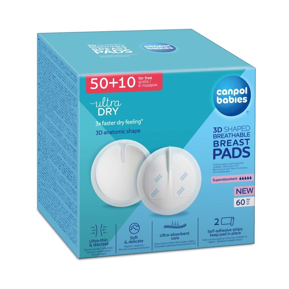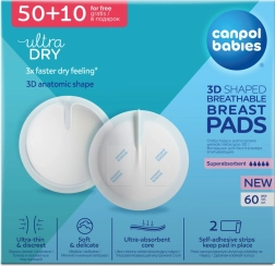 Enkratne prsne blazinice Canpol babies z 3D anatomskim oblikovanjem so idealne za nosečnice in doječe mamice. Ponašajo se z ultra vpojnim jedrom, zračno in mehko zgornjo plastjo ter nepropustno spodnjo bariero, ki ščiti perilo pred premočenjem. Zahvaljujoč 2 lepilnima trakovoma zanesljivo ostanejo na mestu, so zelo tanke (1,3 mm), diskretne in zagotavljajo hiter občutek suhosti. V pakiranju je 60 kosov (50 + 10 gratis).