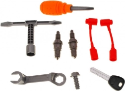 Set vsebuje otroško orodje: križni izvijač, 3‑v‑1 ključ (nasadni + ploščati + križni), 2‑v‑1 ključ (ploščati + obročni) in druge pripomočke. Otroci na varen način preizkusijo osnovna mehanska opravila.