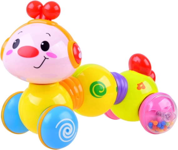 Vesela interaktivna gosenica na kolescih, ki se po pritisku zapelje, sveti in predvaja melodije. Spodbuja plazenje, razvoj motorike in učenje vzroka in posledice že od 6 mesecev.